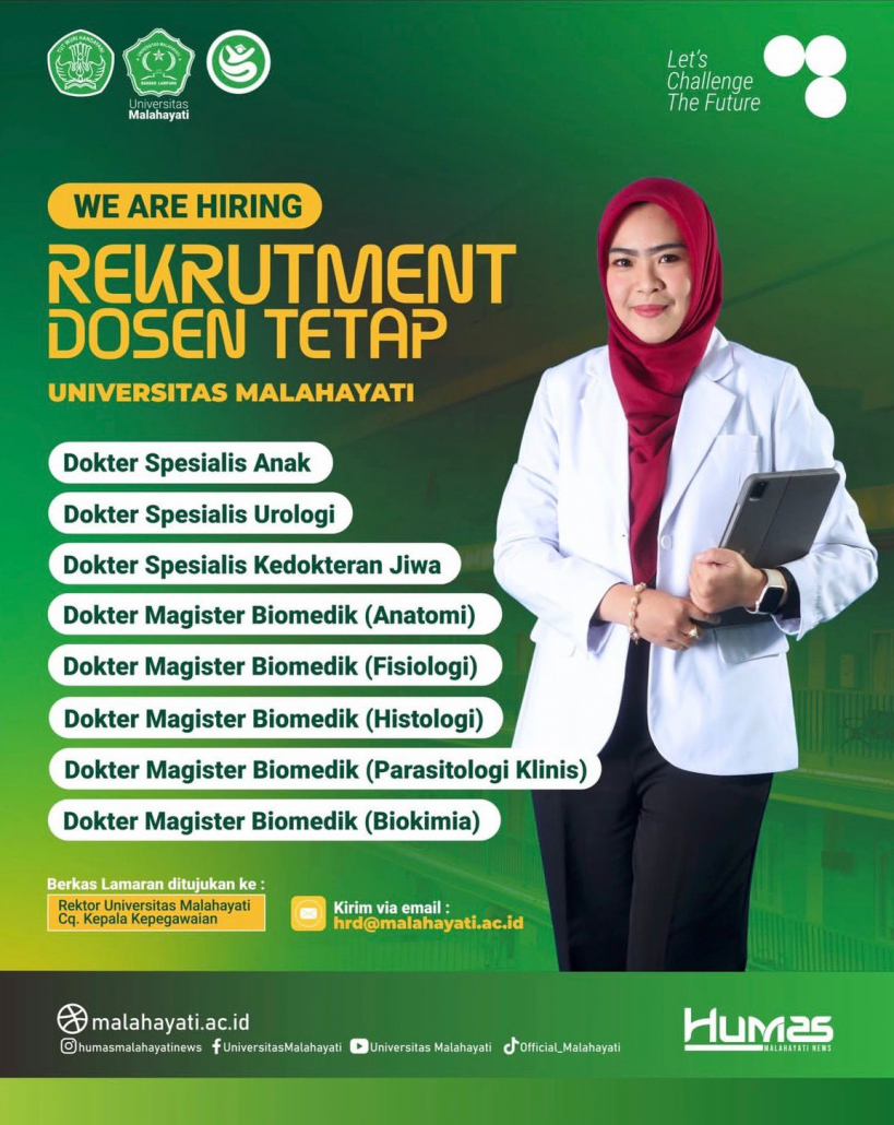 Universitas Malahayati mengajak para tenaga profesional untuk bergabung dalam lingkungan akademik yang dinamis, inovatif, dan berkomitmen pada peningkatan kualitas pendidikan tinggi di Indonesia.