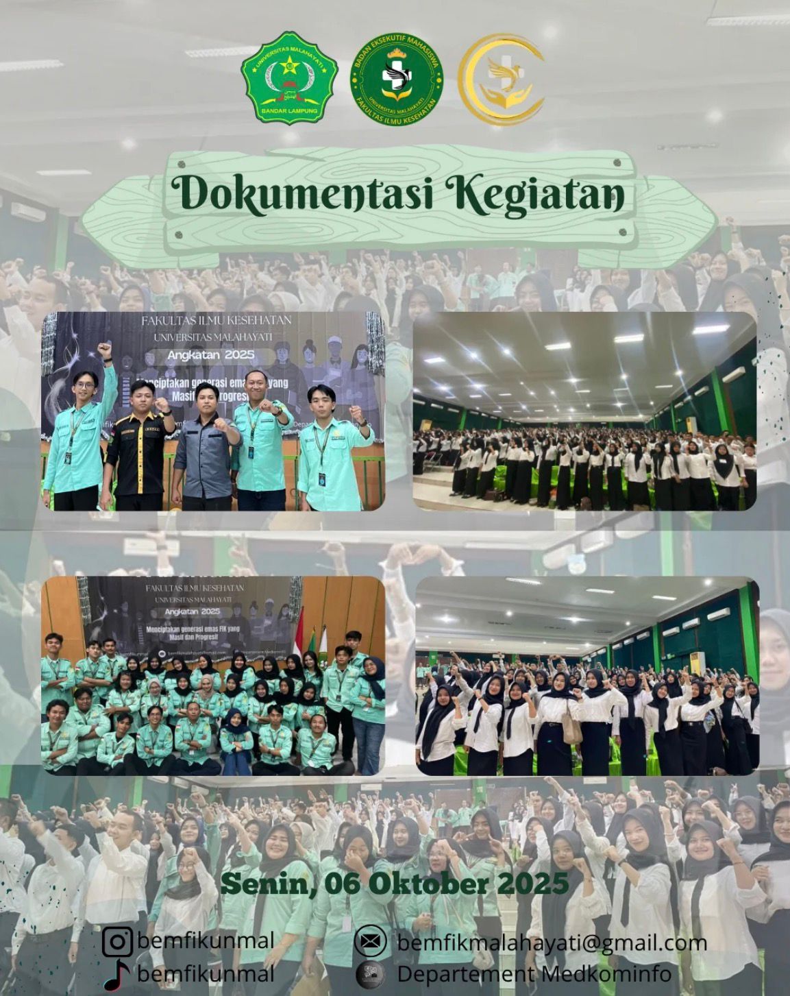 BANDARLAMPUNG (malahayati.ac.id): Badan Eksekutif Mahasiswa (BEM) Fakultas Ilmu Kesehatan (FIK) Universitas Malahayati sukses menyelenggarakan kegiatan Kaderisasi Mahasiswa FIK 2025 yang berlangsung di lingkungan kampus Universitas Malahayati, dari tanggal 6 hingga 19 Oktober 2025. Kegiatan ini diikuti oleh seluruh mahasiswa baru Fakultas Ilmu Kesehatan angkatan 2025 dan mengusung tema “Menciptakan Generasi Emas FIK yang Masif dan Progresif.”