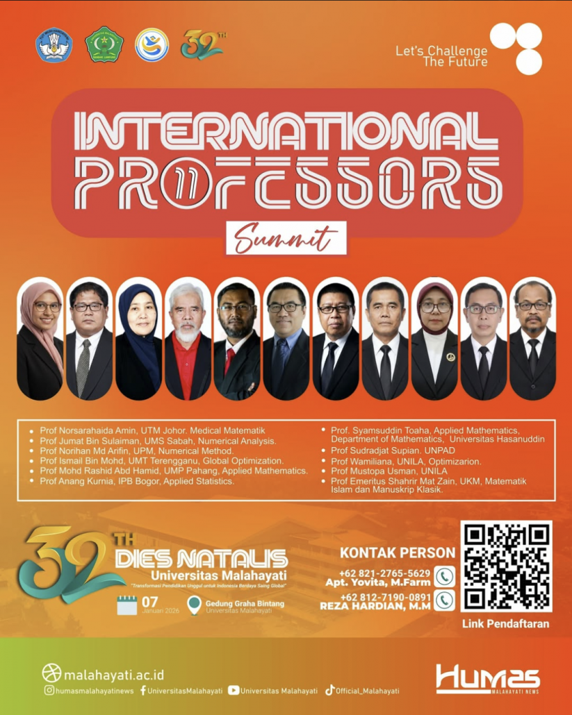 Kegiatan International Professors Summit ini diselenggarakan dalam rangka rangkaian Dies Natalis ke-32 Universitas Malahayati dan akan dilaksanakan pada Selasa, 7 Januari 2026, bertempat di Gedung Graha Bintang Universitas Malahayati, Bandar Lampung. Forum ini menjadi momentum strategis bagi sivitas akademika dan para pemangku kepentingan pendidikan untuk memperkuat jejaring akademik serta meningkatkan kualitas pembelajaran berbasis keilmuan global.