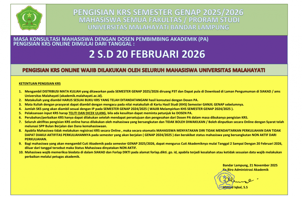 BANDARLAMPUNG (malahayati.ac.id): Universitas Malahayati mengumumkan pelaksanaan pengisian Kartu Rencana Studi (KRS) Semester Genap Tahun Akademik 2025/2026 bagi seluruh mahasiswa dari semua fakultas dan program studi. Pengisian KRS online dimulai pada 2 Februari hingga 20 Februari 2026.