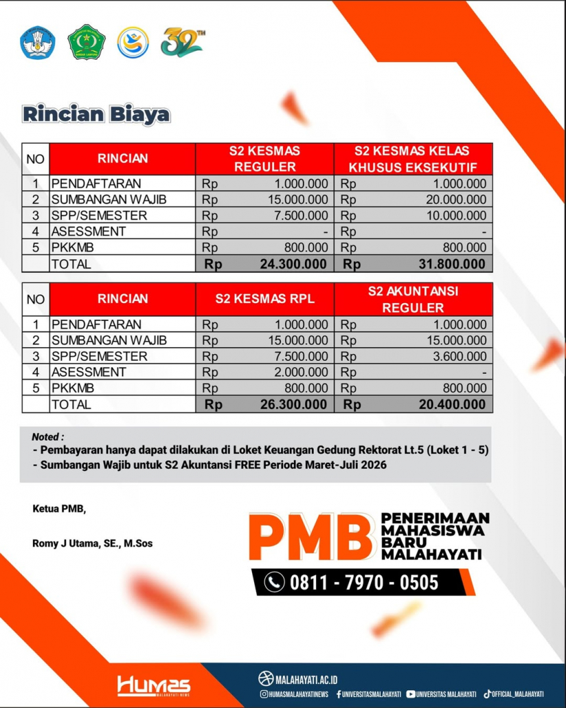Penawaran Khusus: Bebas Sumbangan Wajib S2 Akuntansi Dalam upaya mendukung peningkatan sumber daya manusia di bidang keuangan, Universitas Malahayati merilis kebijakan khusus untuk program S2 Akuntansi Reguler. Selama periode pendaftaran Maret-Juli 2026, calon mahasiswa akan dibebaskan dari biaya Sumbangan Wajib (FREE), sehingga total biaya awal menjadi lebih kompetitif, yakni sebesar Rp5.400.000 (mencakup pendaftaran, SPP semester awal, dan PKKMB).